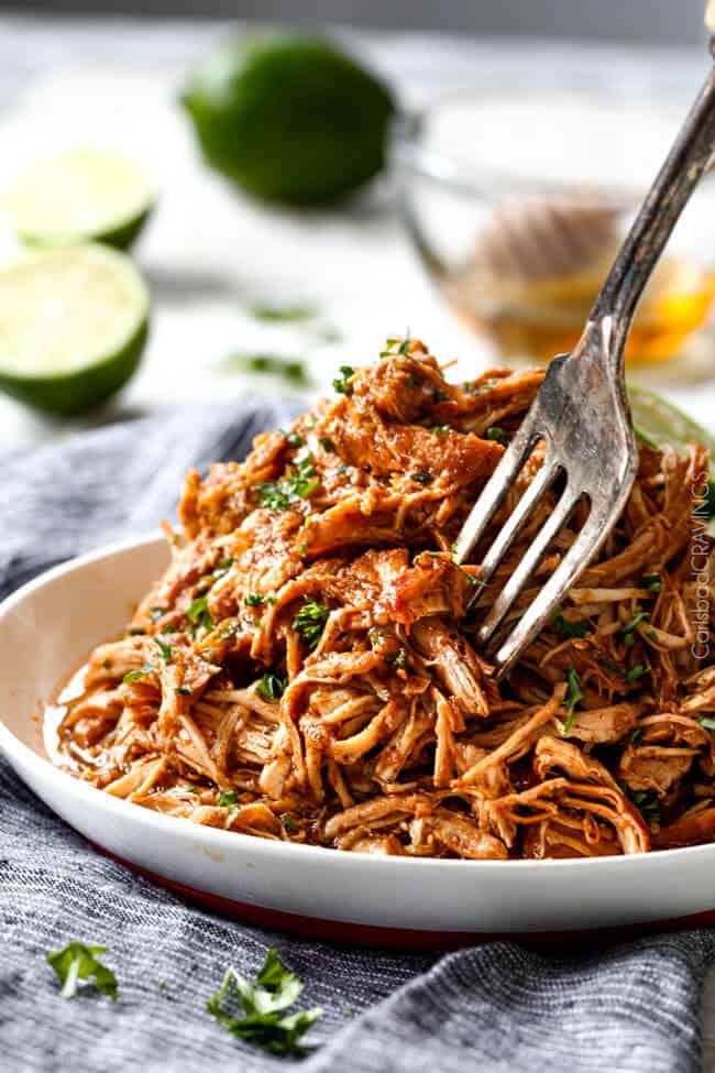 My favorite recipe ever!! I’ve made this about 10 times now. Fresh lime juice is best, and I never end up needing the whole amount. I leave it in the juice after its shredded for as long as possible! Good on rice, in a taco, or added into chili.