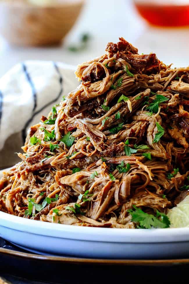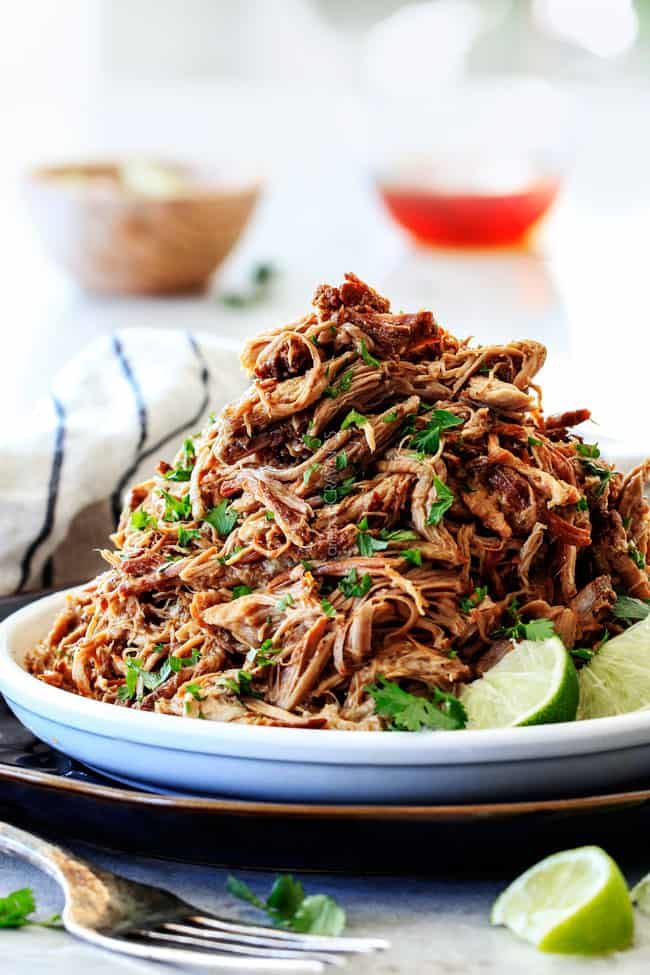 - Cook on LOW for 8 to 10 hours or on high for 5-6 hours OR until pork is fall apart tender and easily shreds with a fork (see notes for the JUCIEST pork).