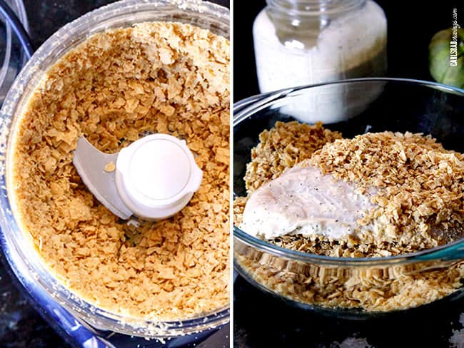 To make this exclaim worthy chicken, you first marinate the chicken in some of the 5 Minute Blender Tomatillo Avocado Ranch. Next, coat chicken in crushed, spiced tortilla chips…