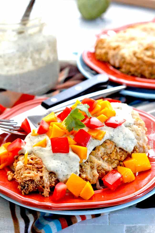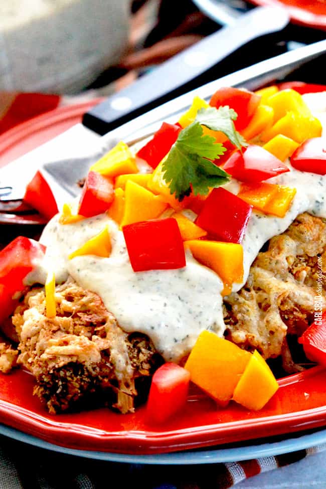 The chicken is then smothered in Tomatillo Avocado Ranch Dressing. A creamy ranch packed with tomatillos, avocado, jalapeno, garlic, cilantro and smoked paprika. A creamy ranch so dreamy its earned its place smothering this chicken.