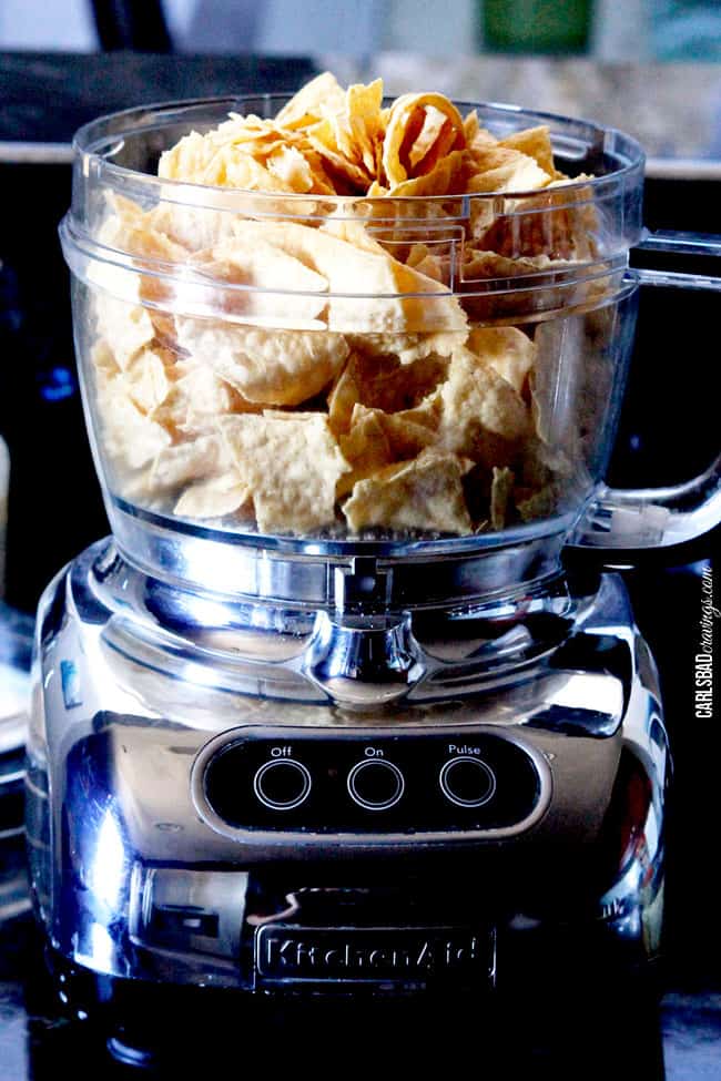 - Add chips to food processor and process until crushed (or crush with rolling pin). Transfer to a large bowl and mix in chili powder, cumin and black pepper.