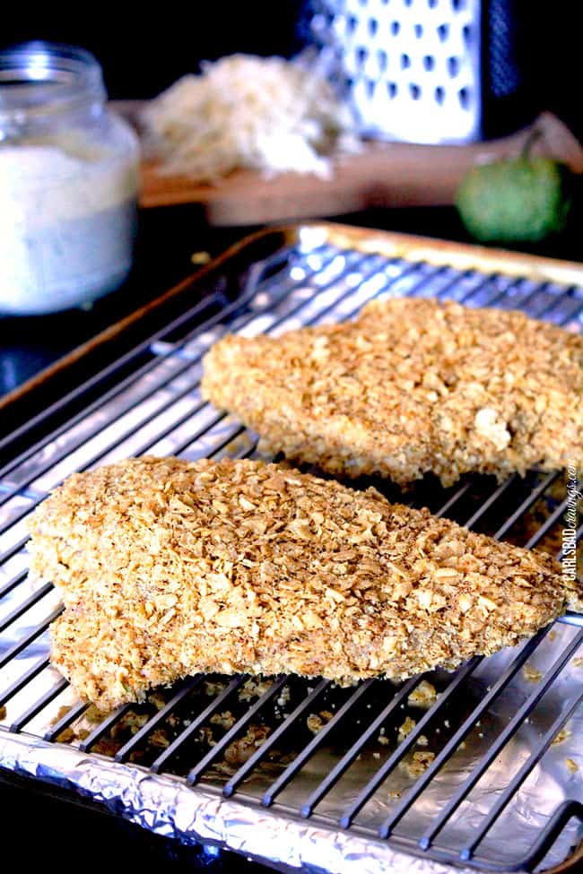 - Remove chicken from marinade then dredge in the chip mixture, pressing chips into chicken to securely coat. Place chicken on the baking rack and bake for 25-30 minutes or until the chicken is cooked all the way through. Top chicken with an additional ¼ cup cheese per breast (more or less to liking) and broil until golden.
