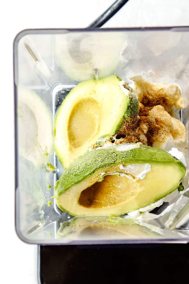 - Add avocado, sour cream or Greek yogurt, mayonnaise, lime juice, salt, ground cumin, and garlic powder to your blender.