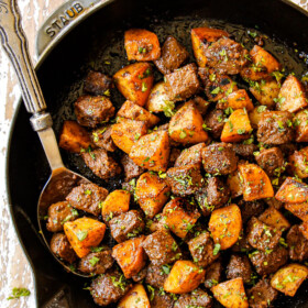 This steak and potatoes recipe is gourmet delicious yet simple enough for everyday! Juicy, steak and potatoes are tossed in a sensational spice rub then pan-seared with garlic herb butter for an explosion of YUM in every bite. It’s a one-skillet wonder that’s quick and easy yet couldn’t be any more comforting, satisfying or dripping with flavor. Serve this garlic butter steak and potatoes skillet with honey roasted carrots and wedge salad for the perfect easy dinner! I’ve included tips and tricks to achieve melt in your mouth, juicy, steak every time, how to prep ahead and how to freeze.