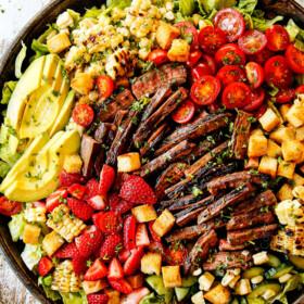 You will also love that this steak salad recipe is very flexible. I’ve selected my favorite veggies for this salad that are bright and fresh with plenty of crunch but you can also swap them with YOUR favorites or whatever you have on hand. You can also swap the croutons for crunchy pepitas or pecans and the strawberries for sweet mangos, pineapple, peaches or craisins.