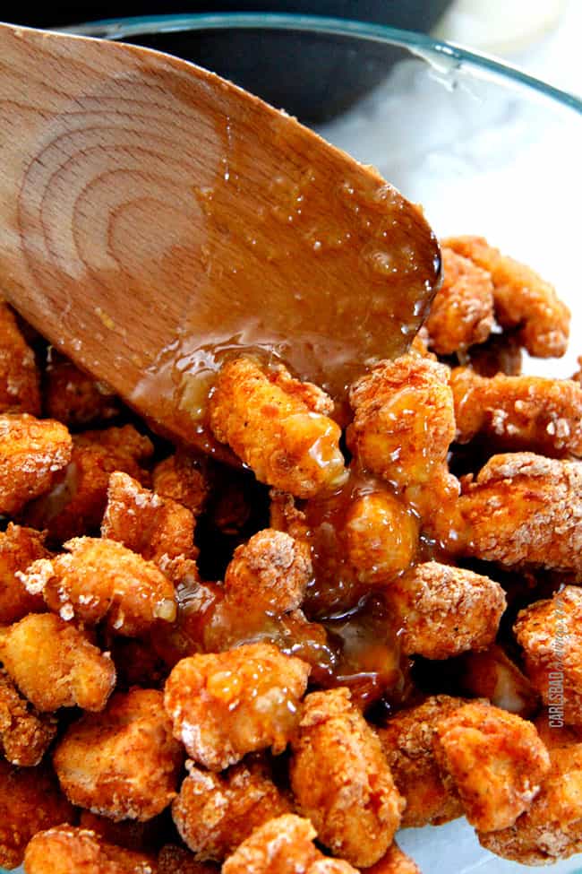 - In a large bowl, toss baked chicken with Honey Lemon Ginger Sauce using a spatula until evenly coated. It will seem like not enough sauce, but keep mixing until it covers all the chicken.