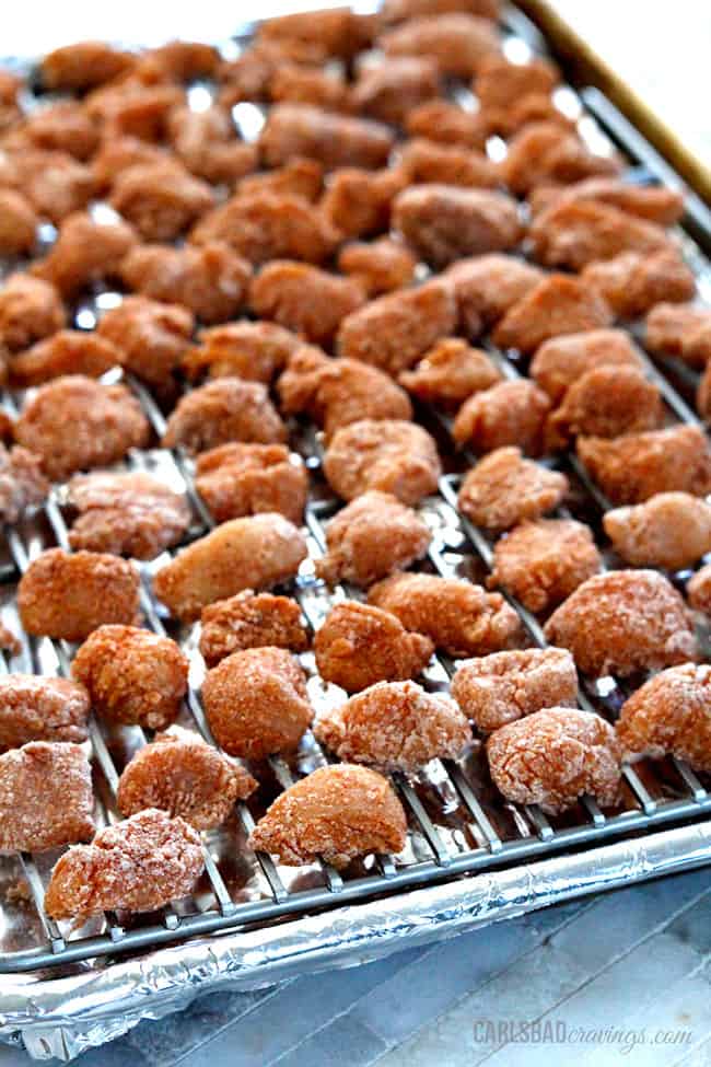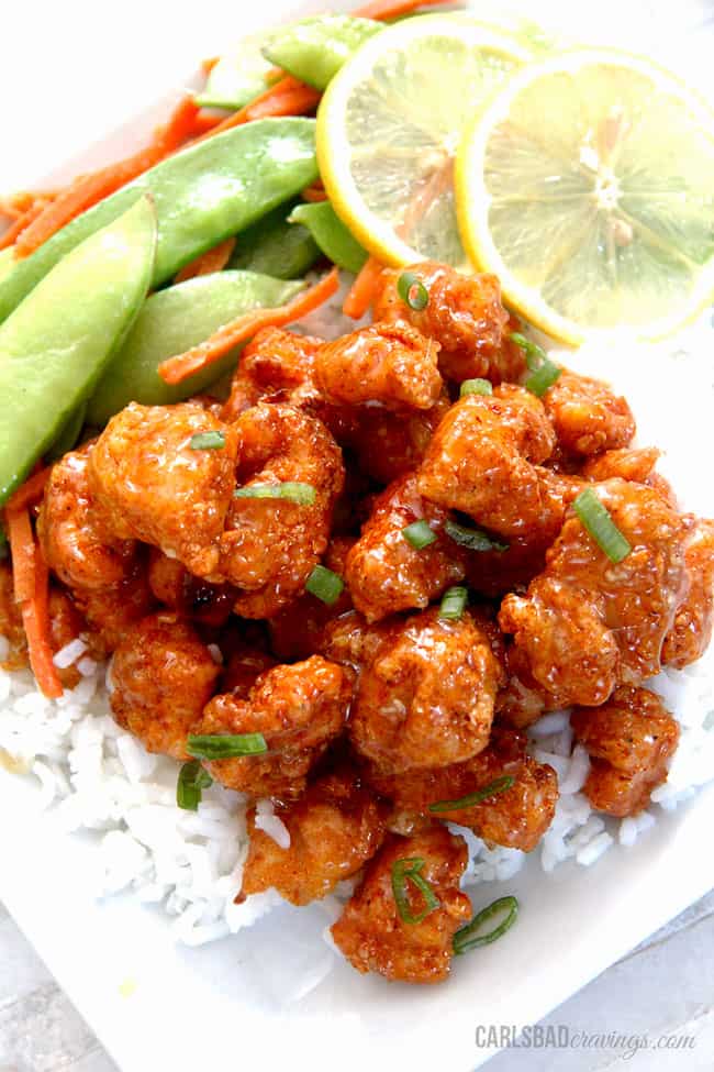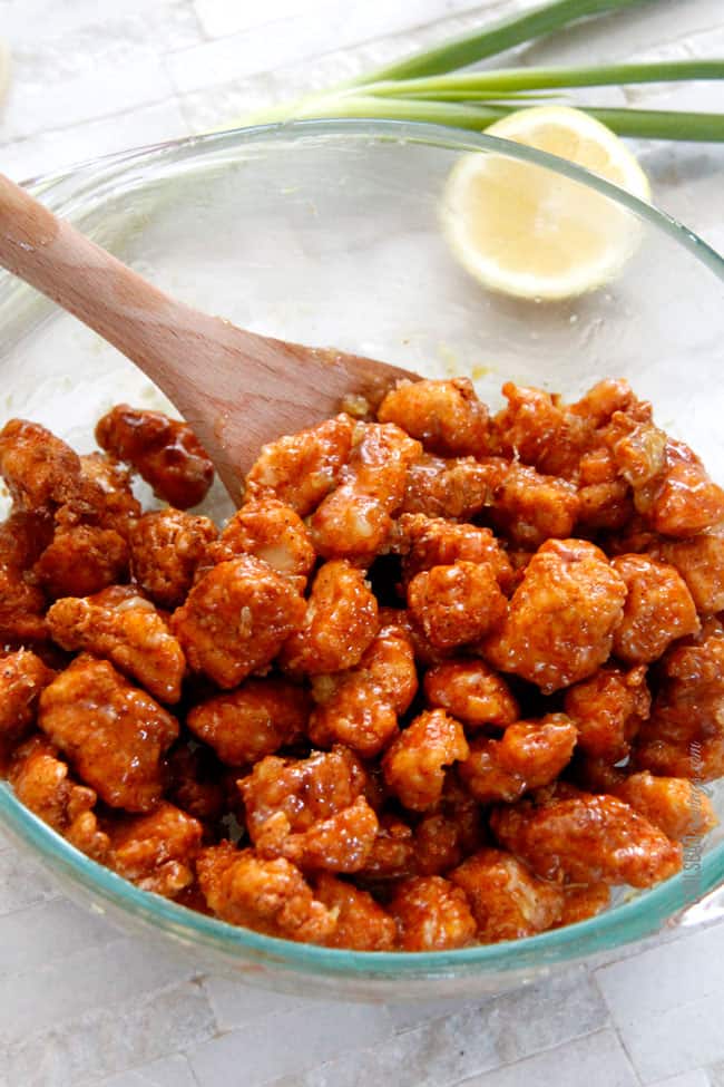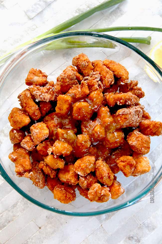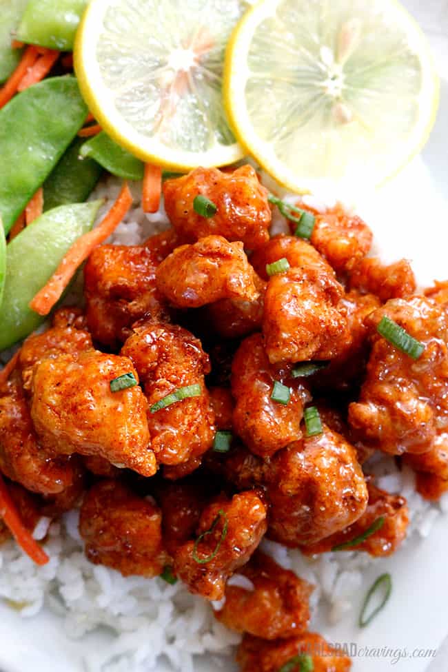 If you stir fry the Honey Lemon Chicken, swap the ratio of cornstarch and flour so you will have 1 cup cornstarch and 2 tablespoons flour. You can see my Honey Coconut Cashew Chicken as a reference (in that recipe I use a marinade and in this recipe we use an egg wash for the breading to stick).