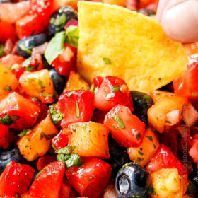 Strawberry salsa is the juicy, sweet and spicy summer appetizer of your dreams! It is stand-alone delicious with just tortilla chips or serve it on top of your favorite grilled chicken, fish, pork, steak, tacos, etc. AKA it makes everything better! This strawberry salsa recipe is made with juicy strawberries, sweet pineapple, bursting blueberries, zingy red onion, zesty cilantro, spicy jalapenos and tangy lime for a mesmerizing balance of sweet, tangy, and spicy. You can can customize the spice level from fiery hot to just a hint of heat and can customize the ingredients as well by adding or omitting any of your favorite fruit and veggies. This strawberry salsa is not only intoxicatingly delicious, but also happens to be guilt free, gluten free and dairy free for a snack or party appetizer win everyone will rave about!