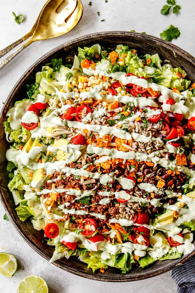 With this recipe, I set out to capitalize on everything already delicious about taco salad – but better. More flavorful meat, lick-the-bowl complimentary dressing, Doritos instead of tortilla chips and roasted, salty sunflower seeds and fresh pops of sweet corn. These little tweaks/additions = the BEST Taco Salad!