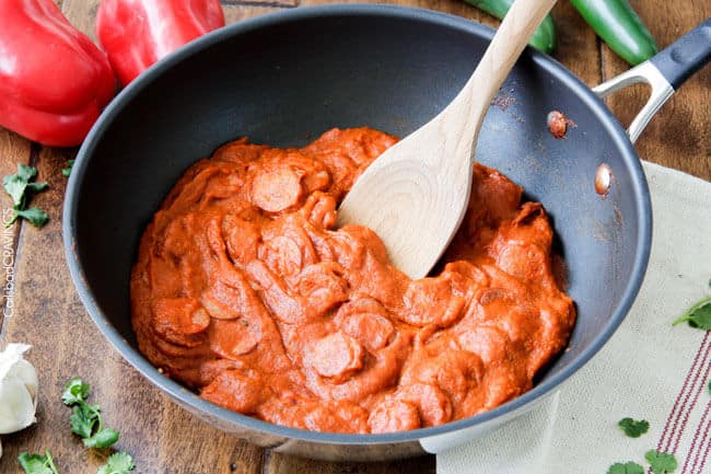 Add the Roasted Red Pepper Puree to your skillet of lightly browned juicy, savory, salty, smoky, sausage along with cumin, smoked paprika and oregano and continue to cook for a few more minutes.