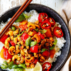 - Add basil. Remove from the heat and stir in the basil and cashews. Serve with rice and dig in!