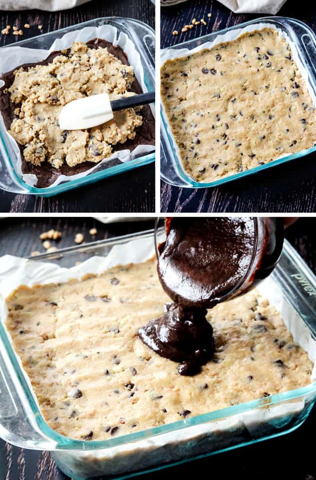 Spread whatever dough isn’t devoured into an even layer on your cooled brownies, then top with a simple chocolate ganache. Cool, slice and eat!