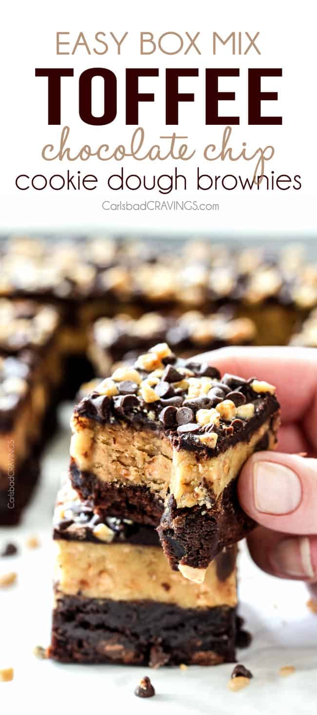 Easy box mix Toffee Chocolate Cookie Dough Brownies don’t get any easier or more delicious! A rich, fudgy brownie topped with eggless, toffee filled chocolate cookie dough. The perfect entertaining dessert or holiday gift for friends and family!