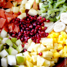 If you are making the Tropical Fruit Salad hours ahead of time, you will want to brush or soak the bananas, apples and pears with some sort of citric acid. Here are a couple options to prevent browning fruit, just keep in mind the bananas should not be soaked for longer than 5 minutes or they can turn mushy – just turn to coat and remove with a slotted spoon: