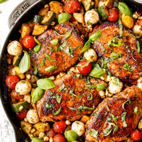 This Tuscan Chicken recipe is summer in a skillet! It’s made with juicy, succulent Italian seasoned chicken, charred sweet corn, tender-crisp zucchini, bursting cherry tomatoes, and aromatic basil and garlic. The caramelized sweet corn with the fresh zucchini and juicy, sweet tomatoes is absolutely hypnotic. The whole skillet comes together in less than 40 minutes with only a 20-minute cook time. Keep this Tuscan Chicken naturally gluten free and low carb or serve it with brown rice, mashed potatoes and breadsticks.