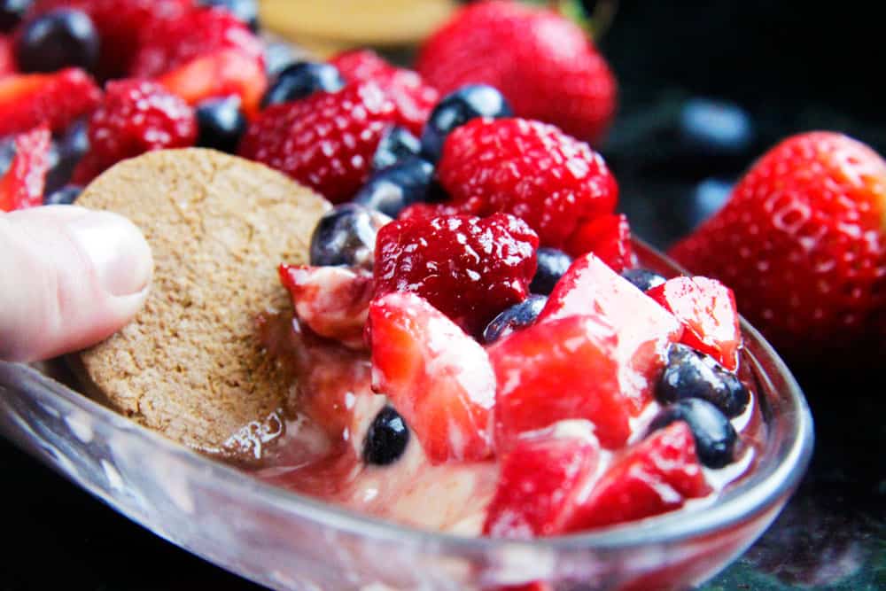 - When ready to serve, spoon berries over the cheesecake filling. Serve with gingersnaps (recommended unless you don’t like them), graham crackers, pretzels, vanilla oreos, etc.