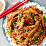 Shred chicken in the crockpot and add 1 1/2 tablespoons cornstarch mixed with 1/4 cup water to the crockpot. Stir contents around. Cook on high for 20-30 minutes until sauce thickens. Taste and add Sriracha for spicier, brown sugar for sweeter if desired. *Alternatively, you can add the cornstarch slurry and liquid from the crockpot to a saucepan and simmer until thickened on the stove - this will create a thicker sauce.*