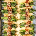 These Bacon Wrapped Green Beans are the perfect elegant side dish for any occasion, including upcoming Thanksgiving and Christmas! The mouthwatering little bundles look impressive but are super simple to make and can be completely assembled ahead of time then just popped in the oven to bake. To make, the green beans are bathed in asweet and tangy brown sugar, balsamic butter sauce, wrapped in bacon then roasted to caramelized perfection. These Bacon Wrapped Green Beans are always a party favorite and is easy to double or triple for a crowd!