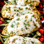Line chicken on top of green beans and spoon over any remaining pesto sauce from the bowl.