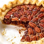 Chocolate Pecan Pie is the deceptively simple dessert of your dreams that will be the first to disappear at every holiday! It’s make ahead friendly, made with ONE BOWL and either store-bought or homemade pie crust that won’t shrink into the filling and is 100% foolproof thanks to my tips and video tutorial. This recipe is leveled upwith dark chocolate, dark brown sugar, dark corn syrup, and a touch of cinnamon and both chopped and whole pecans for the ultimate chocolaty, buttery, nutty, caramel-like filling.