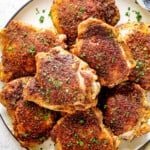Bake chicken: Roast chicken thighs in the preheated oven at 400°F (without flipping), until they register 170°F on an instant read thermometer inserted into the thickest part of the chicken without touching the bone. This will take 35-45 minutes depending on the size of the chicken thighs. (I suggest a digital meat thermometer that bakes with the chicken - this is the one I use as seen in the video). Optional: Turn on the broiler and broil for 1 to 2 minutes to add extra crispiness to the skin. Make sure to watch closely so the chicken doesn’t burn!