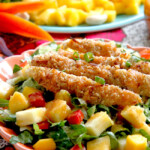 Cashew Chicken Salad with juicy coconut, cashew crusted chicken, pineapple, mangoes, cucumbers, lettuce, green onion and red bell peppers and Pineapple Ginger Vinaigrette! This Cashew Chicken will transport you to the tropics with its paradisaical flavors and textures and you'll never want to come back!