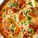 This Chicken Florentine is a comforting, quick and easy one-pot wonder that the whole family will be raving about. It may look impressive and taste phenomenal but it’s deceptively simple to make with pantry friendly ingredients all in one pan. To make this Chicken Florentine recipe, lightly floured chicken cutlets are seared until golden then nestled in a luscious Parmesan cream sauce boasting baby spinach and bursting tomatoes. The sauce is lightened up by using chicken broth and cornstarch along with the heavy cream so you can give into your desires to lick you plate. Serve this Chicken Florentine over pasta, mashed potatoes or rice with a big green salad and breadsticks and you have a spectacular, simple, saucy, repeat favorite