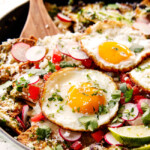 enchilada sauce (Chilaquiles Rojos), topped with cheese then served with eggs, beans, cilantro, radishes and/or sour cream. They are intoxicatingly flavorful from the aromatic bath, use pantry friendly ingredients so they can be made at any time, are a scrumptious way to use leftover Mexican chicken, pork or beef, and SO versatile – you can top them with virtually anything. They are also fabulous for make ahead meals or entertaining because the chips, sauce and toppings can all be prepped in advance- just add chips to the simmering sauce, top with cheese and bake for 5 minutes - THAT’S IT!