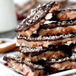 My Mother-in-laws famous homemade toffee recipe! Toffee slathered with chocolate, sprinkled with crushed pecans on a bed of toasted almonds. If you are not a toffee addict yet, this will make one out of you. Toffee is my favorite treat to make for the holidays because not only is it super easy, makes fabulous gifts because it makes a large quantity, stores beautifully and you don't have to roll individual cookies!