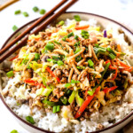 Egg Roll in a Bowl is like a deconstructed egg roll or an unstuffed egg roll - AKA it tastes like an egg roll without all the work! You get to enjoy the pleasure of the juicy sesame, soy pork, shredded cabbage, julienned carrots, aromatic ginger, and garlic in quick and easy skillet form – without filling, rolling or deep-frying egg rolls! This Egg Roll in a Bowl recipe is not only a fabulous quick dinner, but leftovers taste sensational as well, making it perfect for meal prep. Serve this Egg Roll in a Bowl recipe over rice or cauliflower rice then drizzle with my sensational creamy Sesame Chili Sauce and your whole family will beg for this recipe again and again!