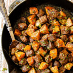 This steak and potatoes recipe is gourmet delicious yet simple enough for everyday! Juicy, steak and potatoes are tossed in a sensational spice rub then pan-seared with garlic herb butter for an explosion of YUM in every bite. It’s a one-skillet wonder that’s quick and easy yet couldn’t be any more comforting, satisfying or dripping with flavor. Serve this garlic butter steak and potatoes skillet with honey roasted carrots and wedge salad for the perfect easy dinner! I’ve included tips and tricks to achieve melt in your mouth, juicy, steak every time, how to prep ahead and how to freeze.