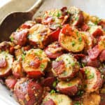 This German potato salad is a must-have-recipe for your fabulous side dish repertoire. It’s made with tender, red potatoes dressed in warm, tangy, mustard and bacon vinaigrette loaded with crispy bacon and fresh herbs. It’s best served warm to maximize the vinegar, crispy bacon punch, but is also delicious served room temperature for convenience. This German potato salad recipe is super easy to make by cooking bacon in a skillet, sautéing onions in the bacon drippings, then adding chicken broth, vinegar and sugar to simmer and reduce to make the dressing. Stir in the boiled red potatoes while their still hot to drink up the sassy, lip-puckering, grainy mustard, bacon-studded dressing and watch it disappear!