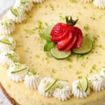 Transfer whipped cream to a piping bag fitted with a large tip. You can pipe the stabilized whipped cream onto the room temperature cheesecake before you pop it into the fridge or any time after that. The beauty of stabilized whipped cream is it will hold its shape indefinitely. If using regular whipped cream, top just before serving. Garnish cheesecake with berries, lime wedges, lime zest and mint if desired.