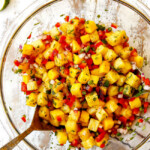 This Pineapple Mango Salsa is a mesmerizing combination of sweet, tangy, spicy, fresh and is as delicious plain as it is with tortilla chips or on top of favorite grilled chicken, fish, pork, steak, tacos, etc. It’s made with juicy pineapple, sweet mangos, crunchy bell peppers, zingy red onion, zesty cilantro, spicy jalapenos and tangy lime for the perfect balance of sweet heat – in minutes! This pineapple mango salsa recipe is super simple to make and easy to customize with different add-ins or the spice level. It’s also guilt free, gluten free and dairy free for a snack or party appetizer win everyone will rave about!