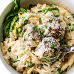 Reduce heat to low and stir in Parmesan cheese until melted, followed by mozzarella cheese until melted. Stir in fresh basil and fresh parsley, followed by orzo and meatballs, adding additional milk if necessary to reach desired consistency. Taste and season with additional salt, pepper and/or red pepper flakes to taste.