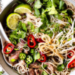 This pho soup recipe will have you slurping a big bowl of steaming hot pho in less than 60 minutes! The easy broth is bursting with beefy, earthy, complex yet delicate flavors laced with quintessential cinnamon, star anise, cloves and cardamon. I’ve shortcut the long simmering processes by using quality beef bone broth then adding charred onions and ginger and toasted spices, then simmering for just 45 minutes while you prep the garnishes. To your rich, savory pho broth, you can add beef, chicken, pork or shrimp along with your chewy rice noodles, a handful of fresh herbs and a splash of lime juice, hoisin and sriracha. This pho recipe also earns major points because it can be prepped ahead or frozen and then just warmed when ready, so you can sit back and enjoy pho in your slippers just the way you like it!
