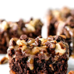 Crazy moist Poke Turtle Brownies seeping with pockets of caramel, infused with pecans and chocolate chips, smothered in the BEST chocolate frosting and topped with more caramel AKA the best brownies EVER!