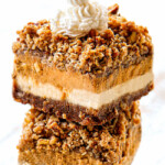 These Pumpkin Cheesecake Bars will be the hero of every gathering and are easier to make than you think (just watch the video)! They begin with an easy cinnamon graham cracker crust, topped with plain cheesecake, pumpkin cheesecake then cinnamon pecan streusel to create dynamic decadent bites of rich and creamy AND satisfyingly crunchy. These intoxicatingly delicious Pumpkin Cheesecake Bars are also a winner because they are make ahead friendly which eliminates all of that last minute stress/hassle, don’t require any special baking pans or a water bath. I’ve included detailed instructions on how to make these Pumpkin Cheesecake Bars so even if you’ve never made cheesecake before, they will be the runaway hit of the season!