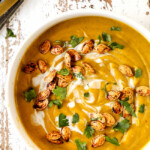 This pumpkin soup recipe is Fall in a bowl! It’s luxuriously creamy, rich and velvety, layered with flavor from roasted pumpkin, onions, garlic, Granny Smith apple, coconut milk, warm and earthy cinnamon, ginger, nutmeg, cloves and sweetened up a bit with a kiss of maple. The ingredients simmer together in a fragrant aromatic bath then all get blended together to create the most hypnotic pumpkin soup you ever tasted – without any guilt! This creamy pumpkin soup recipe is also make ahead friendly and freezer friendly for stress free dinners or lunches throughout the week. Now get ready to curl up and warm up with big bowl of velvety roasted pumpkin soup!