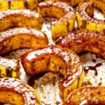 Roast: Add the squash slices to prepared baking sheet in a single layer without touching (reserve any remaining glaze). Bake for 15 minutes, then brush the tops of the squash with remaining glaze. Flip over, and bake an additional 15-20 minutes depending on desired tenderness/caramelization.