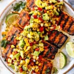 Using tongs and a metal fish spatula, carefully turn the fish onto the other side, so that the flesh side is down, the skin side is up. Grill for another 2-3 minutes depending on thickness, until the fish reaches 125-130 degrees F on an instant read thermometer. Remove the salmon from the grill and tent with foil and let rest 5 minutes before servings. Meanwhile make the Cilantro Lime Butter if using: Add butter to the reserved 1 ½ tablespoons marinade in the microwave safe bowl. Microwave for 30 seconds then at 10 second intervals until melted. Stir in the lime juice and cilantro. Brush salmon with butter and serve extra on the side. Top fish with avocado corn salsa, corn salsa, mango salsa, or pineapple salsa and dig in!