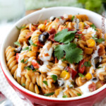 While chicken is baking, heat 1 tablespoon olive oil over medium high heat. Add red onion and saute 2 minutes then add red bell pepper, black beans, corn, tomatoes,