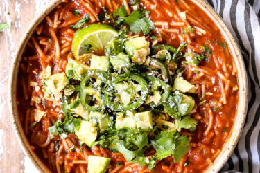 Don’t skimp the garnishes! The garnishes are especially important in sopa de fideo because the soup itself is rich and brothy without many textural components other than the fideo noodles. The soup needs the brightness and contrasting crunch the toppings provide.