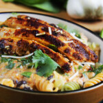 Add pasta to the sauce and stir until well combined. Top individual servings of pasta with chicken and cilantro.