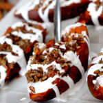 These Twice Baked Sweet Potatoes are about to become your new favorite Thanksgiving side! They are stuffed with creamy mashed sweet potatoes spiked with brown sugar, maple, cinnamon, nutmeg and cayenne, topped with crunchy, sweet and salty Bacon Pecan Streusel then drizzled with silky sweet Marshmallow Cream. They are decadently delicious and always a crowd favorite. These Twice Baked Sweet Potatoes can be made ahead of time and refrigerated or frozen (instructions included) for an easy, stress-free heat and eat side!