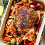 In the center of a 9×13 baking dish, add the potatoes, carrots, onions, fennel, garlic, salt, and pepper. Toss with 1 ½ tablespoons olive oil, then push into an even layer. Add the fresh herbs to the center of the pan in a pile so the chicken will cover them. Pour 1/2 cup chicken broth into the pan from the side corner (If not adding carrots, increase broth to 1 cup). PREP AHEAD: Take care the cut side of the potatoes are submerged in broth, or they will discolor. Alternatively, add them just before roasting.